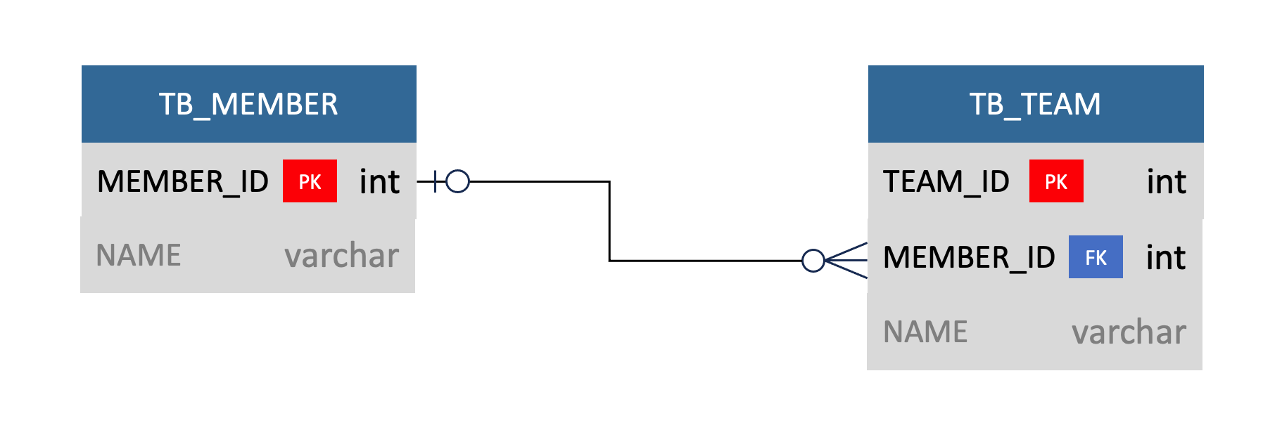 예를 들어, (단방향 관계)Member 엔터티가 Team 엔터티를 참조하는 경우 Member 엔티티는 Team 엔터티를 참조할 수 있지만, Team 엔터티는 Member 엔터티를 참조할 수 없다. (➔ 일대일 관계 예시로는 국가-수도, 사람-지문 등이 더 적합할 것 같다.)